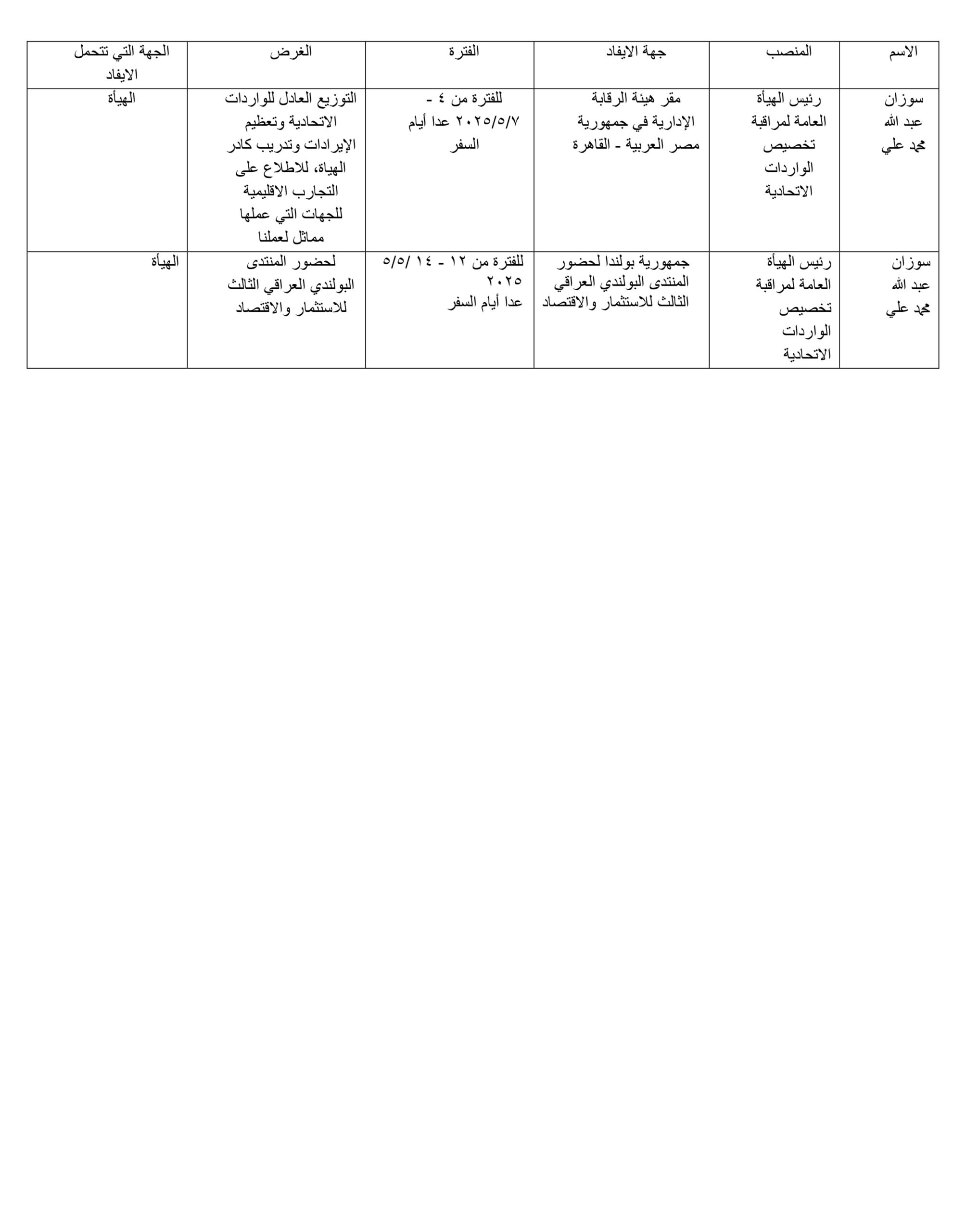 إشارة الى الى كتاب الأمانة العامة لمجلس الوزراء/ دائرة شؤون مجلس الوزراء واللجان ذي العدد (ش.ز/10/1/اعمام/12350) في 11/4/2011 نرفق لكم جدول الايفادات الرسمية للهيأه العامة لمراقبة تخصيص الواردات الاتحادية